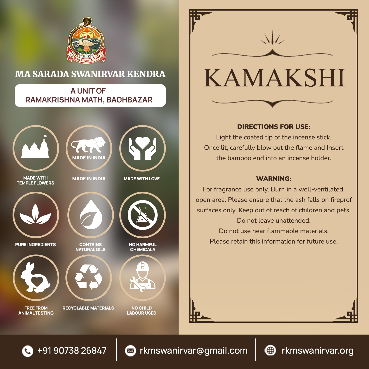 - Ramakrishna Math (MSSK) Organic Incense Stick (Herbal) is the perfect solution for creating a tranquil atmosphere. It is premium quality, long-lasting, made with natural ingredients, eco-friendly, easy to use, and perfect for gifting. Made in India, Ramakrishna Math (MSSK) Organic Incense Stick ensures the highest quality and durability. Its unique blend of herbal and Kamakshi scents provides a long-lasting fragrance and guarantees a serene environment. The sustainable materials used in Ramakrishna Math (MSSK) Organic Incense Stick offer a clean burn, making it suitable for both indoor and outdoor use and perfect for those who appreciate eco-friendly products. Our incense sticks are simple to light and maintain, designed to enhance meditation sessions and promote relaxation. Ramakrishna Math (MSSK) Organic Incense Stick is suitable for all ages. Available in a divine Kamakshi scent. Ideal for home, office, spa, and yoga studios, offering a calming and soothing aroma that enhances the ambiance of any space.